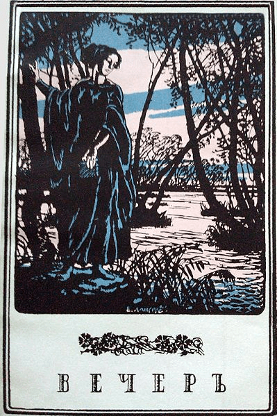 Images: Kuuma Petrov-Vodkin (1878 – 1939): Anna Akhmatowa (1922); St. Petersburg, Russian Museum; Anna Akhmatova (1904); : Cover of Akhmatova’s first book of poems (Vyecher/Evening), designed by Eugène Lanceray (1912);Anna Akhmatova with her first husband, Nikolai Gumilyov, and her son Lev, 1915; photo by L. Gorodetsky (all pictures from Wikimedia Commons)