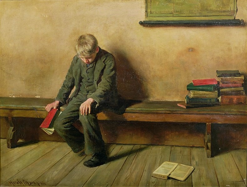 Harold Copping (1863 – 1932): The Dunce (1886); Bournemouth, Russell-Cotes Art Gallery & Museum (Wikimedia Commons); Photo of Jacques Prévert (1920s); photographer unknown; Paris, Musée Carnavalet